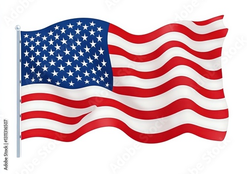 An American flag waves gracefully in the wind against a white background