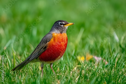 An American Robin stands alert in a lush green field of grass