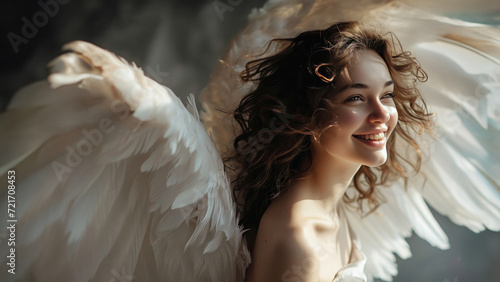 An angelic woman with a captivating smile and wings radiates positivity on a serene gray background. Generative AI.