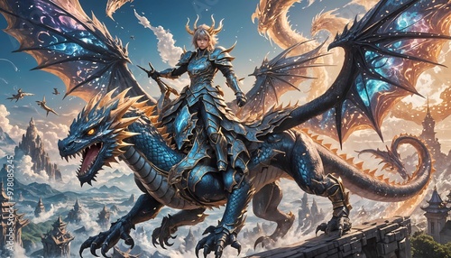 An anime character riding on the back of a massive, glowing dragon