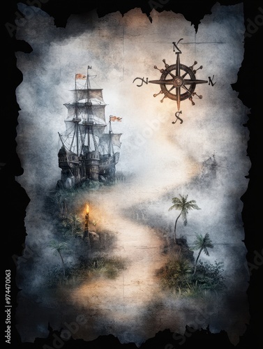 pirate, ship, antique, map, compass, rose, adventure, exploration, fantasy, storytelling, navigation, treasure, quest, nautical, journey, old, historic, parchment, mysterious, ocean, sea, unknown, island, tropical, torch, fog, mist, coast, landmark, symbol, pathway, maritime, cartography, design, background, concept, travel, vintage, illustration, expedition, discovery, tale, mythology, legend, theme, artistic