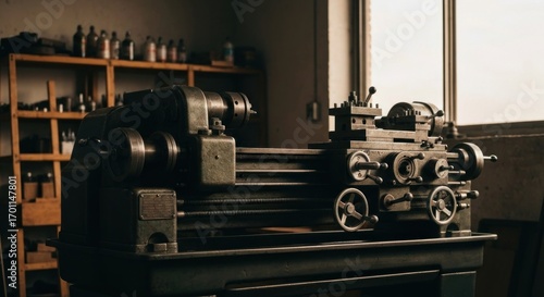 lathe, metal, workshop, machinery, antique, industrial, tool, equipment, manufacturing, vintage, dark, shadowy, metalworking, old, factory, workstation, precision, engineering, technology, mechanic, production, workplace, machine, room, light, window, shelf, container, background, detail, focused, still, aged