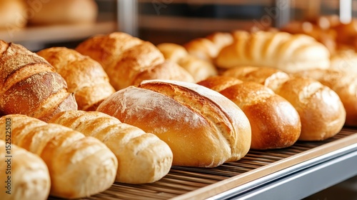 An appealing selection of freshly baked bread loaves is showcased in a bakery, highlighting the artisan craftsmanship and deliciousness of freshly made bread products.