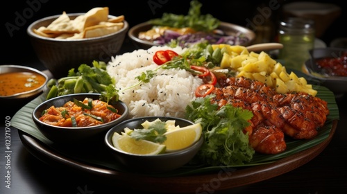 An appetizing image of an Indian food platter with rice, tandoori chicken, and multiple side dishes