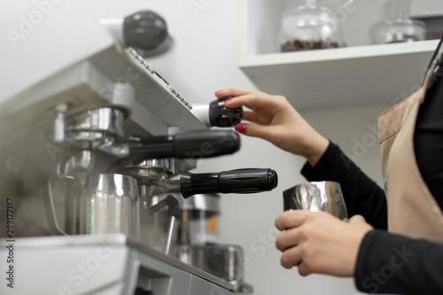 An apron barista pours hot cocoa into a cup. Barista work in a coffee shop