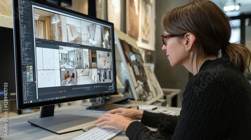architect, adjusting, texture, material, three-dimensional, interior design, software, large, monitor, digital, visualisation, professional, creative, innovative, technology, building, construction, shape, colours, pattern, lighting, shadow, reflections, realistic, virtual, space, room, decor, furniture, aesthetic, functional, modern, contemporary, traditional, minimalist, luxury, elegant, user-friendly, detailed, customized, stylish