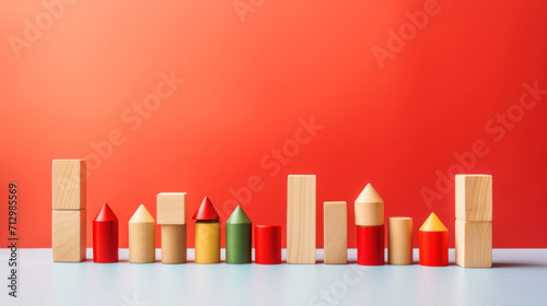 An arrangement of colorful wooden blocks in various shapes on a bright red background.