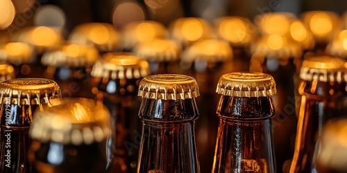 An array of beer bottles with golden caps, showcasing an appealing close-up view under warm ambient lighting.