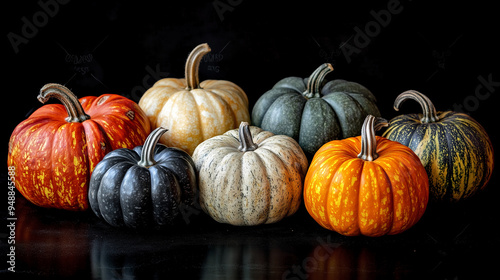 pumpkin, fall harvest, autumn, seasonal, variety, halloween, thanksgiving, dark background, nature, rustic, gourd, squash, autumn, decorative, natural beauty, festive, agriculture, organic, vegetable, harvested, countryside, traditional, fall season, cosy, garden, earthy, autumn color, farmhouse, harvest festival