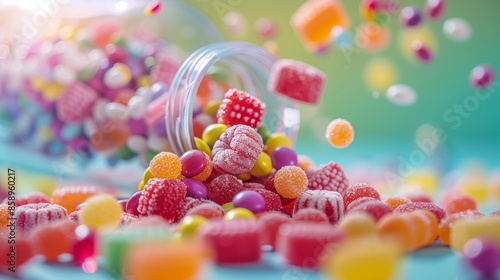 An array of pastel candies and sugarplums pouring out of a tipped bottle, captured in a dynamic close up, sweet disarray