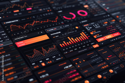 An array of trading monitors displaying colorful stock market graphs and analysis, set against the backdrop of a city skyline at dusk..