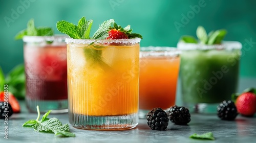 An array of vibrant cocktails garnished with fresh fruits and mint, perfect for summer gatherings, showcasing refreshing colors and enticing textures.