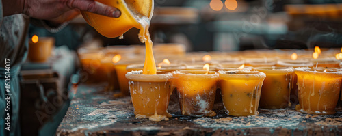 An artisan pouring molten wax into molds to create handcrafted candles, each one unique in its shape and fragrance.