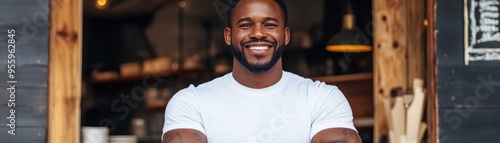 artist, promotional, create, man, smile, entrepreneur, proud, confident, business, build, fresh, black, wall, brand, goal, hair, success, male, owner, glasses, work, retail, launch, blur, day, street, pitch, share, growth