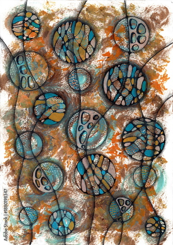 An artistic abstraction consisting of a system of interconnected spheres and circles connected by fine lines. Within each sphere is a unique mosaic pattern reminiscent of cells under a microscope, sea