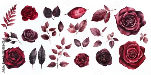 An artistic arrangement of red roses and leaves in a watercolor style, suitable for various designs such as greeting cards, prints, or decorative elements.