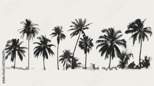 An artistic minimalist black ink drawing of various palm trees, showcasing the simplicity and elegance of nature through a monochromatic scheme and clean lines.