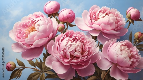 An artistic portrayal of pink peonies in full bloom set against a soft blue background, capturing the essence of natural beauty and grace.