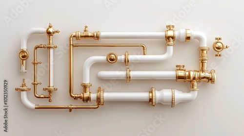 An artistic representation of bath shower pipes showcases a series of interconnected pipes at various angles, isolated against a light gray background. This creative depiction highlights the complexit