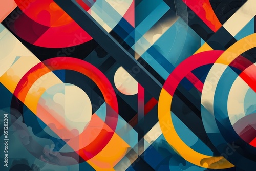 artistic, representation, geometric, abstraction, using, bold, shape, contrasting, colours, convey, sense, depth, movement, visually, engaging, styled