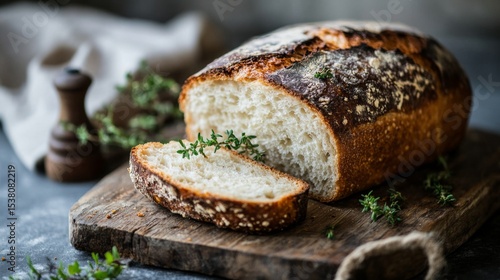 An artistic shot of a loaf of bread with a slice cut out, revealing the soft, airy crumb inside, placed on a rustic wooden board with a few fresh herbs.