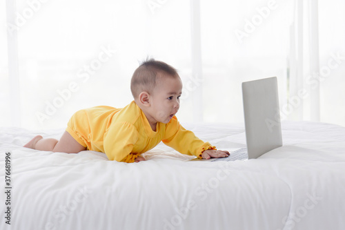 An Asian baby is playing on a laptop on a clean white bed.