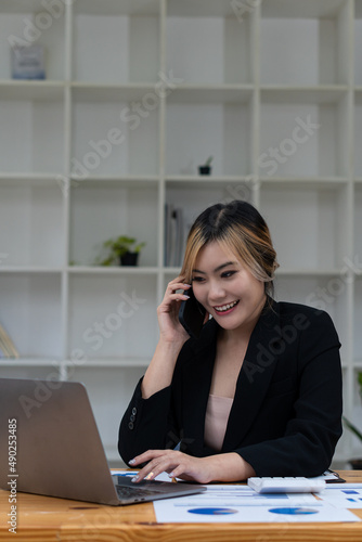 An Asian female accountant with a smartphone works with financial graphs and calculators to make calculations showing investment results. Plan a successful business growth process.