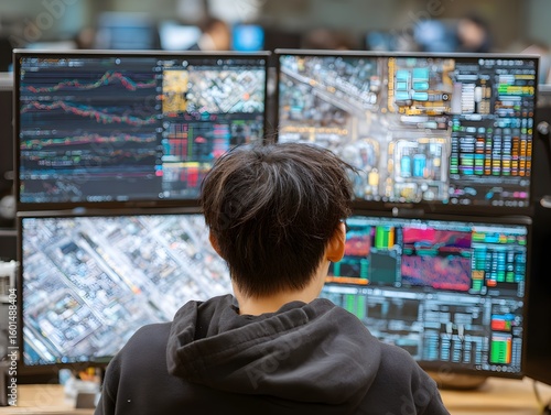 stock exchange, city view, computer, office, man, analyst, trader, technology, finance, investment, monitor, chart, graph, business, asian, person, working, backview, dark, indoor, occupation, financial, economy, trading, city landscape, urban, information, screen, desktop, workstation, workspace, professional, male