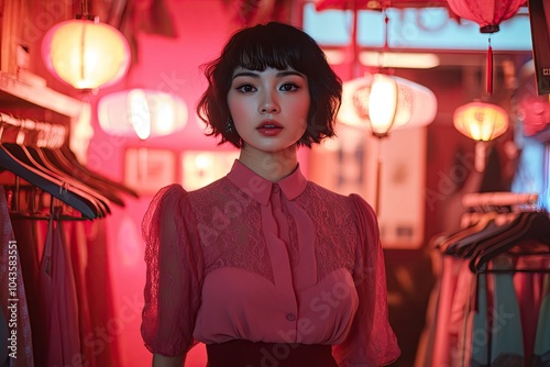 an Asian woman in her late thirties wearing a pink blouse and a dark red skirt, standing inside a store. She has short, straight hair