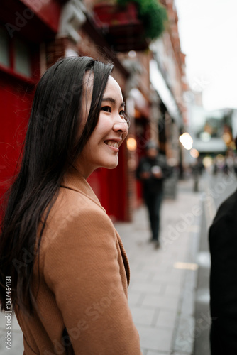 An Asian woman smiling while walking in the city