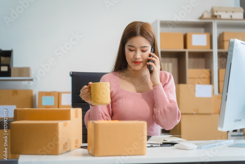 An Asian young woman sits in a room, working on a computer and making calls or video calls, managing her small business and online sales, surrounded by cardboard boxes ready for shipping.