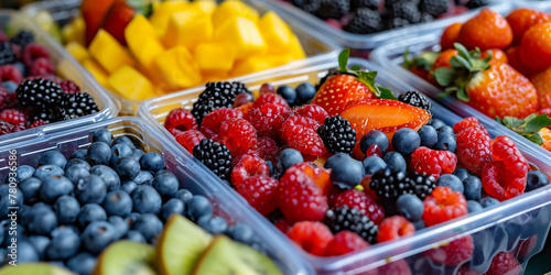 An assortment of berries and fresh fruit chunks neatly arranged in individual containers, epitomizing convenient nutrition.