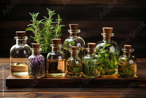 An assortment of essential oil bottles with fresh plants from which they're derived, like lavender, peppermint, and rosemary, arranged on a wooden surface. Generative AI