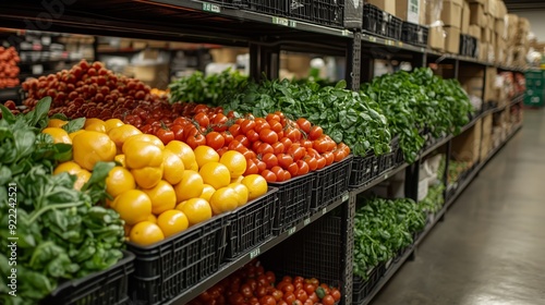 An assortment of fresh vegetables including ripe red and yellow tomatoes, green leafy vegetables, and other produce neatly organized on shelves in a warehouse or grocery store setting