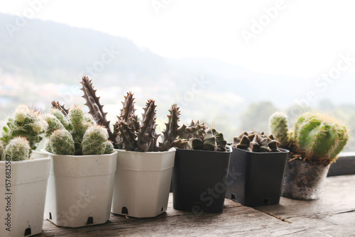 cactus, potted plants, succulent, mountain, nature, desert plant, wooden table, view, scenery, decoration, houseplant, greenery, serene, natural light, arranged, beautiful, atmosphere, relaxation, hobby, collecting, home decor, landscaping, spiky, growth, green, variety, wood texture, depth, dimension, sharpened, blur, background, landscape, terrain