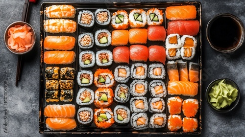 An assortment of sushi, including maki and nigiri, arranged in a rectangular tray, accompanied by soy sauce, wasabi, and pickled ginger
