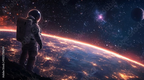 astronaut, dark, terrain, gazing, glowing, planet, horizon, orange, light, illuminated, huge, starry, galaxy, star, planet, space, cosmic, exploration, universe, futuristic, night, sky, celestial, traveler, extraterrestrial, scene, science fiction, adventure, distant, cosmos, awe, infinite, orbit, nebula, discovery, planetary, deep, star, astronomy, blue, moon, bright, cloud, black, science, abstract