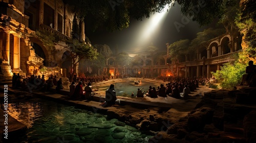 ritual, ancient, amphitheatre, ruin, mystical, atmospheric, gathering, historic, tradition, culture, architecture, spirituality, historic site, ceremony, night, moonlight, spiritual, heritage, community, calmness, mystery, event, cultural, performance, sacred, peace, meditation, prayer, majestic, civilisation, unesco, world heritage, worship, congregation, belief, reverence, ambience, solemn, archaeology, torch, enigmatic