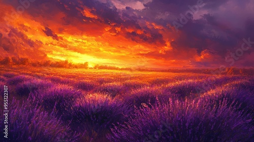 An atmospheric scene of lavender fields at sunset, with mist rising from the ground and the sky glowing in rich hues of orange and purple --ar 16:9 --v 6.1 Job ID: 0e1e0d59-875a-4ecc-af90-093b3751ef22