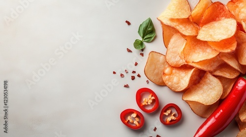 An attractive arrangement of crispy potato chips displayed alongside sliced red chili, sprinklings of dried chili, and fresh basil leaves, perfect for snack lovers.