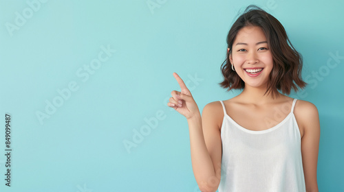 An attractive Asian model pointing with a smile, standing against a serene light blue background with ample copy space.