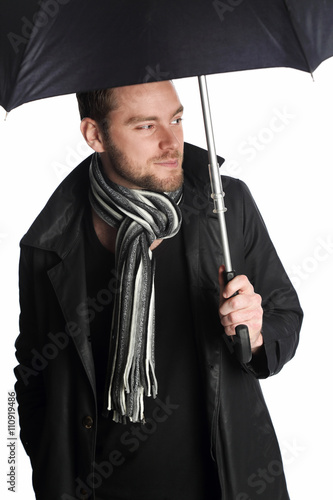 man, man, male, jacket, coat, rain, cover, umbrella, fun, happy, joy, smiling, toothy smile, satisfied, healthy, lifestyle, outdoors, outside, weather, raining, white background, studio shot, one person, people, attractive, photogenic, model, fashion, trendy, mature, adult, macho, cool, standing, 20s, holding, foulard, tan, beard, blue eye, brown hair, vertical, weekend, black, clothing, wear, caucasian, swedish