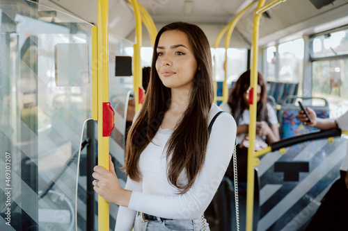 An attractive student spends her morning on the bus going to university, a young beautiful woman uses public transportation stands at the door waiting for the vehicle to stop at the bus stop