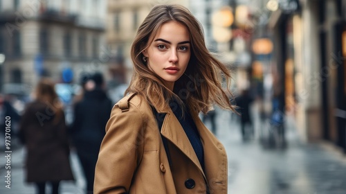 An attractive woman with a confident expression, walking down a bustling city street in a stylish trench coat
