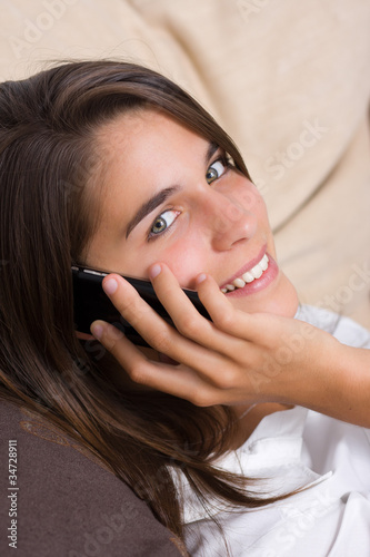 couch, girl, lifestyle, phone, talking, woman, beautiful, caucasian, mobile, adult, attractive, brunette, casual attire, cheerful, comfortable, communication, cute, female, happy, home, house, indoor, leisure, living, lying, modern, people, person, pretty, relaxed, sitting, smile, smiling, sofa, speaking, wireless, young