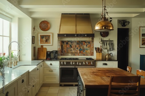 An eclectic kitchen featuring a harmonious blend of different styles, periods, and influences. Experiment with a bold color palette, varied textures