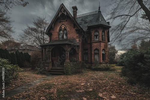 house, victorian, gothic, eerie, skittish, porch, covered, step, brick, red, brown, window, door, leaf, autumn, fall, tree, branch, sky, cloud, overcast, dark, shadow, overgrown, abandoned, neglected, mysterious, intrigue, creepy, haunted, old, ancient, historic, architecture, design, style, landscape, exterior, front, yard, path, stone, grey, foliage, green, nature, photo, photo