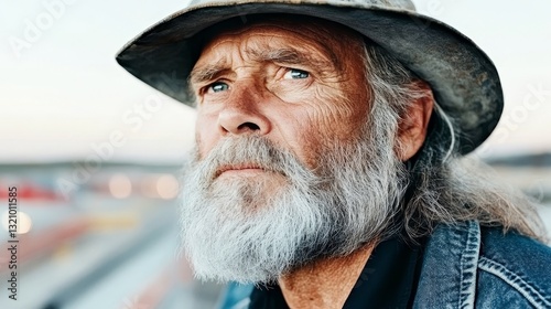 An elderly black coal miner with a long gray beard and a mustache, wearing an old hat, staring sideways at the camera. The light of golden time outlined his weathered face and profound gaze