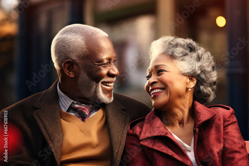 An elderly dark-skinned couple, a man and a woman, are hugging on a bench in the park. They enjoy communication. Date. Older African American lovers. Relationships in old age. Love and romance.