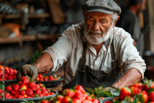 An elderly man carefully selects ripe strawberries at a market stall, showcasing the fruits of hard labor.